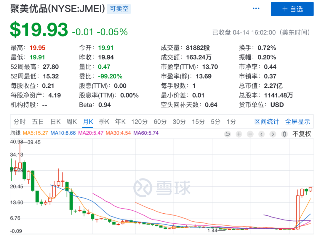 而聚美优品也随之结束了六年的上市生涯。截至4月14日美股收盘,聚美优品的股价为19.93美元/股,总市值为2.28亿美元,较巅峰时期已经蒸发96%。