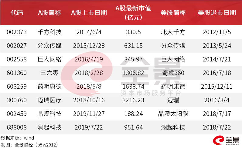 自2014年以来,已有千方科技、分众传媒、巨人网络等8家公司回归A股,其中,迈瑞医疗(300760)最新市值超3200亿元,是目前8家企业中最高的一家。