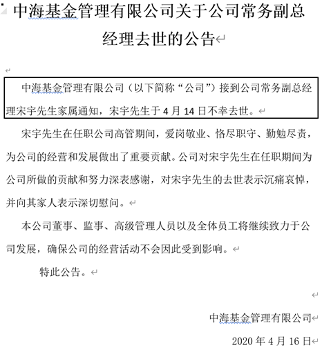中海基金表示,“宋宇在任职公司高管期间,爱岗敬业、恪尽职守、勤勉尽责,为公司的经营和发展做出了重要贡献。公司对宋宇先生在任职期间为公司所做的贡献和努力深表感谢,对宋宇先生的去世表示沉痛哀悼,并向其家人表示深切慰问。”