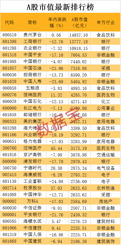 贵州茅台A股市值重回沪深两市第一位。证券时报·数据宝统计显示,截至午间收盘,贵州茅台最新A股市值1.49万亿元,超过工商银行的A股市值1.38万亿(剔除H股市值),再度登上A股市值榜榜首,成为A股第一大权重。