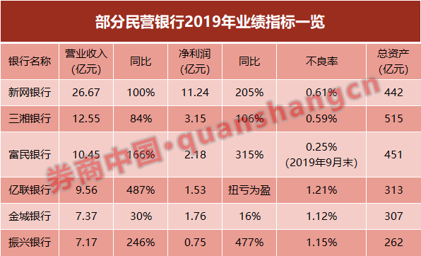 另外2家民营银行亿联银行和振兴银行,由于业绩基数小,2019年净利增速也较为惊人。