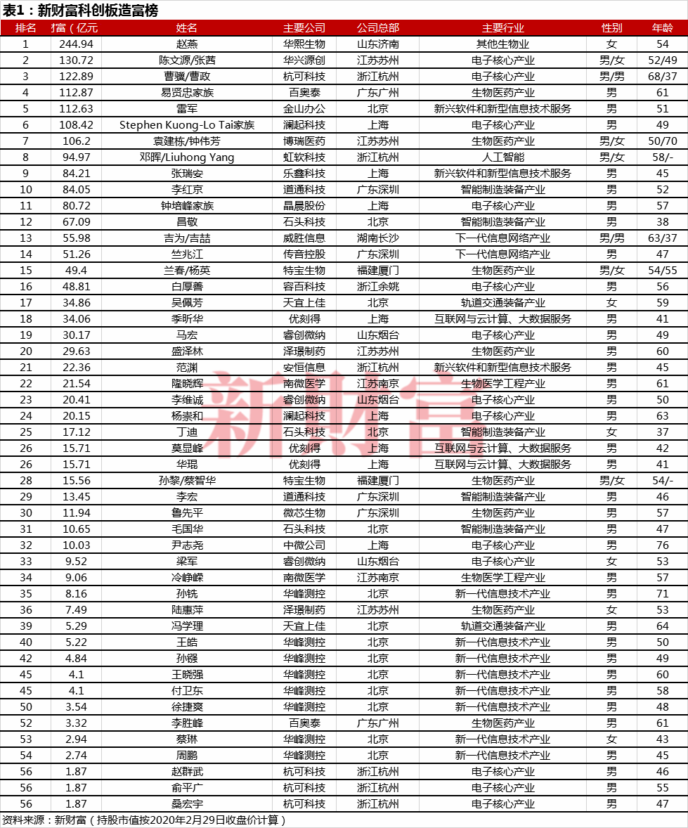 新财富统计截至2020年2月29日上市的91家科创板公司的情况发现,市值100亿元以上的公司有37家。在其中可统计的58名自然人股东中,身家超百亿的有7人,首富被华熙生物的赵燕收入囊中。而石头科技的昌敬,今年38岁,创业5年身家达到67亿元。该公司还有位神秘80后女股东丁迪,合计323万元的投资如今蝶变为17亿元的持股财富。