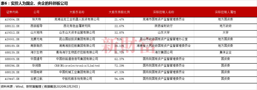 民营企业是科技创新的主力军,国有企业同样是强劲的生力军。在科创板中,有不少国企、央企。已经上会的213家科创板公司中,共有10家公司的实控人属性为非自然人和公司,其中实控人为地方国资委、地方政府的有4家;实控人为国务院国资委的有4家,还有两家分别为山东大学和海尔集团公司(表6)。