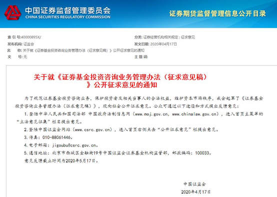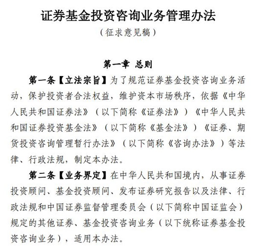 4月17日,为规范证券基金投资咨询业务,保护投资者及相关当事人的合法权益,维护资本市场秩序,证监会起草了《证券基金投资咨询业务管理办法(征求意见稿)》(下称《管理办法》),并向社会公开征求意见。