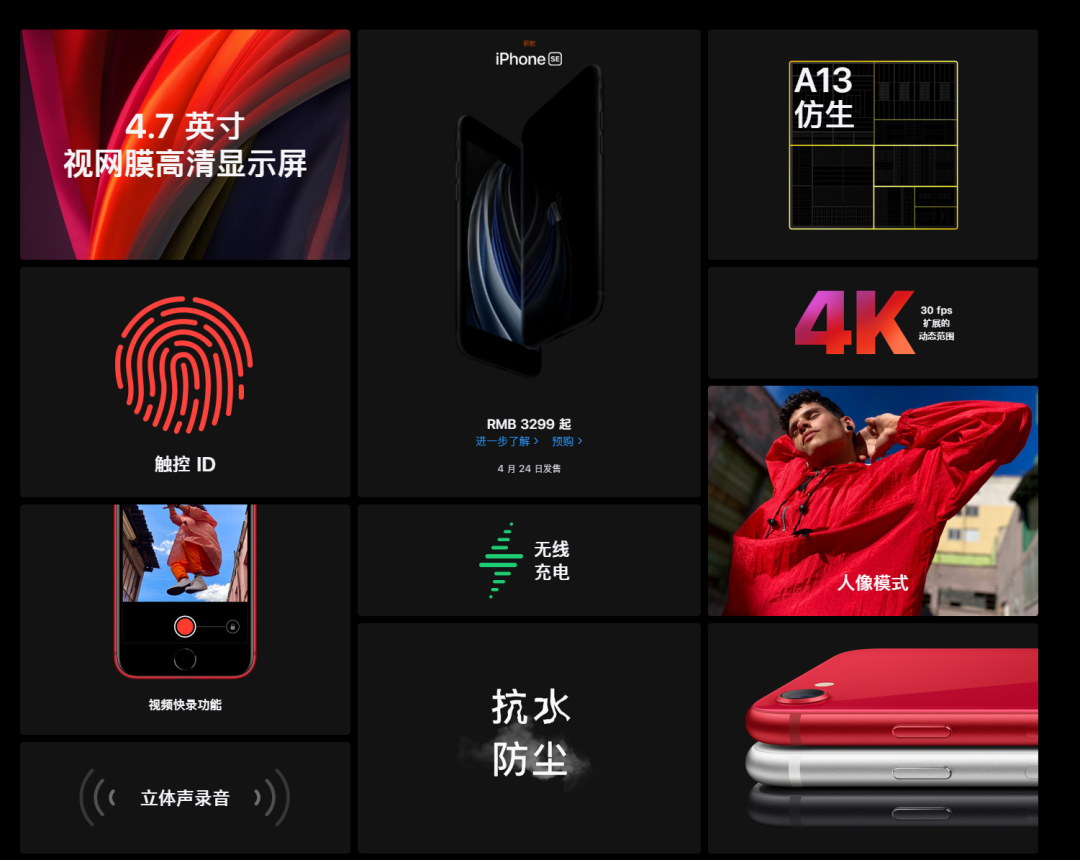 新的第二代iPhone SE的名称与2016年推出的首版iPhone SE相同,新款iPhone SE配备4.7英寸LCD显示屏和Home按钮,采用更快的A13芯片和3GB内存。新款iPhone SE为非全面屏,没有“刘海”,有黑、白,红三种颜色;64GB、128GB和256GB三种存储规格可选。