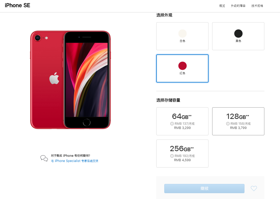具体来说,iPhone SE有64GB、128GB 和256GB三档,黑白红三色可供选择。按照内存规格不同,在国内的销售价格分别是3299元、3799元和 4599元。