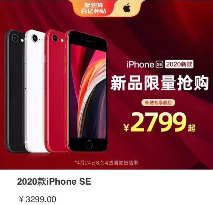 4月18日,聚划算百亿补贴上线新IPhone SE,64BG版本售价为2799元起,较原价立减500元,相当于85折。