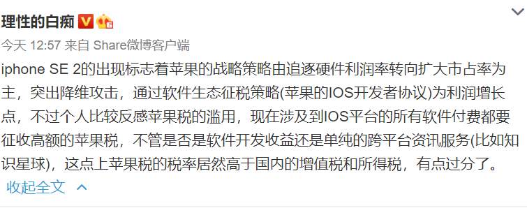 也有分析称iphone SE 2的出现标志着苹果的战略策略由追逐硬件利润率转向扩大市占率为主,突出降维攻击。