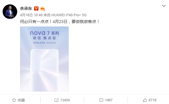 面对苹果的攻势,国产手机中率先站出来的依然是华为。iPhone SE手机虽然悄悄上线,但其“新iPhone SE,一点一点说”的文案却意外走红。对此,余承东发微博直接叫板“何必只有一点点!4月23日,要做就做焦点”,4月23日也就是P40系列之后华为下一款手机Nova7系列的发布日。