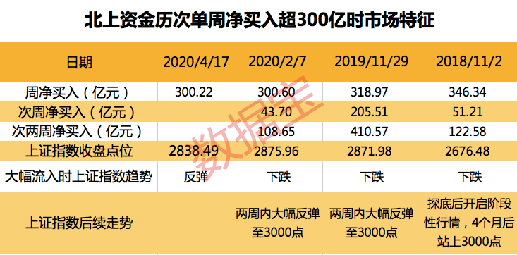本周北上资金净买入A股300.22亿元,单周净买入金额史上第四次突破300亿元大关,前三次分别发生在2018年11月,2019年11月和今年2月。证券时报·数据宝统计发现,北上资金四次大举流入前后市场呈现出了一些相似特征。