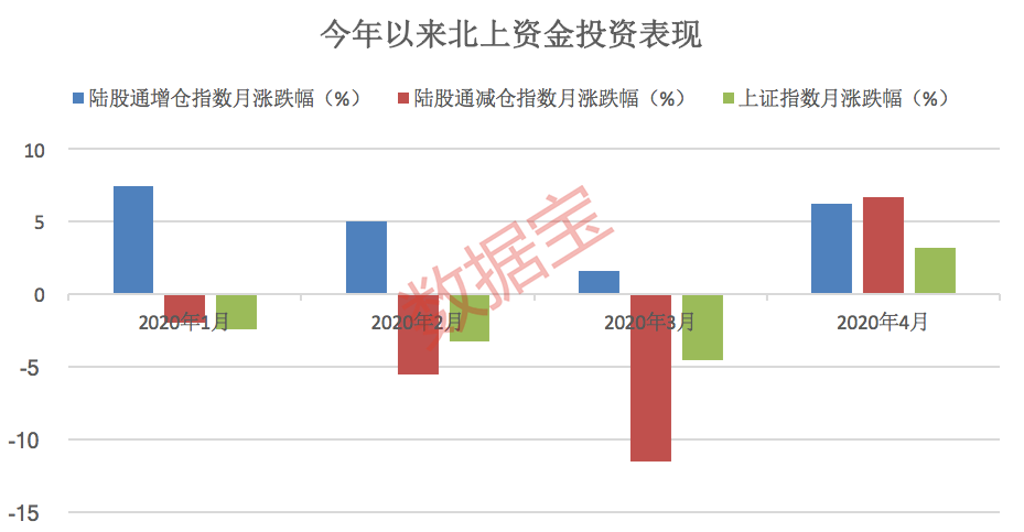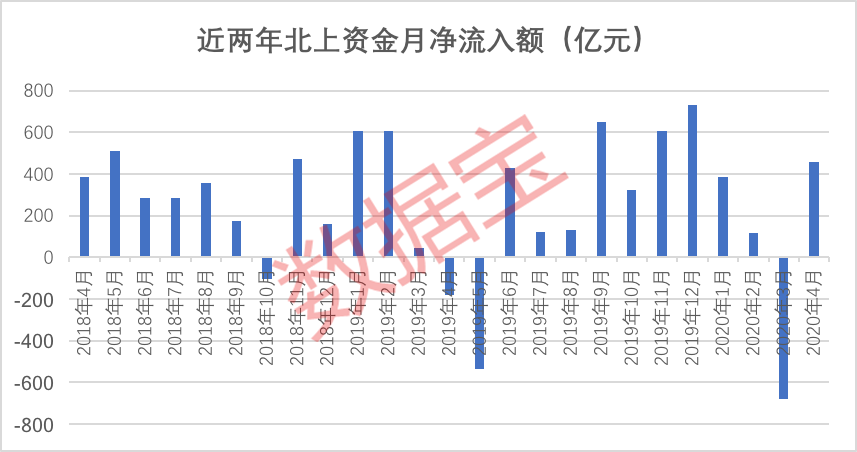 数据宝统计,自2016年以来北上资金仅有4个月资金净流出超百亿元,分布在三个时期,分别为2018年10月,2019年4至5月和2020年3月。