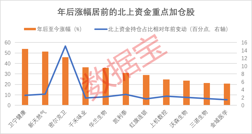 个股胜率方面,年后北上资金加仓幅度居前的50只个股中,33股跑赢大盘,胜率66%。受疫情对市场大幅波动的影响,北上资金胜率虽较去年全年有所下滑,但相对于同期上证指数7.26%的跌幅,这一胜率已十分可观。卫宁健康、新天然气、密尔克卫等6只北上资金重点加仓股节后至今股价已累计上涨超30%。