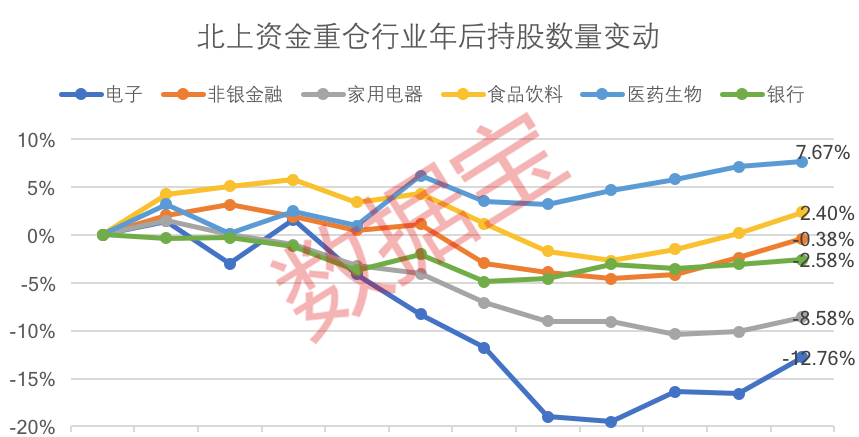 电子、家用电器行业为第三集团。这一集团为短期受疫情影响较为严重但长线弹性较好的行业,经过调整后值得重点关注。最新数据显示,北上资金对这两个行业的持股数量相比于春节前分别减少了12.76%和8.58%,海信家电、阳光照明、京东方A等个股减持幅度居前。