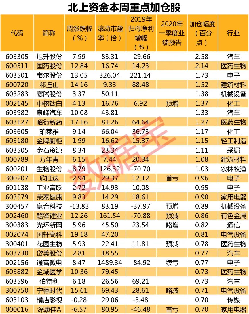 市场表现来看,本周北上资金加仓居前的20股涨多跌少,19股股价上涨且跑赢大盘,仅赢合科技下跌。北上资金仍维持着“优等生”的高投资胜率。国轩高科本周股价涨幅最大,上涨19.18%,昭衍新药、祁连山、韦尔股份等同样涨幅较高。