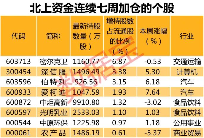 将时间拉长,8股被北上资金连续七周加仓。密尔克卫获累计加仓幅度最大,相比七周前北上资金持股比例增加了6.87个百分点。深信服、伯特利、爱柯迪、中炬高新、光明乳业近七周内北上资金加仓幅度也超过1个百分点。