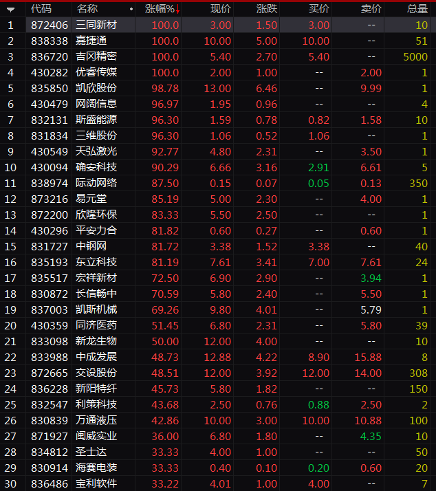 新三板竞价交易的个股中,超20只股票涨幅超50%,其中三同新材、嘉捷通、吉冈精密、优睿传媒等个股涨幅超100%,凯欣股份、网阔信息、斯盛能源、三维股份等多股涨幅超过90%。