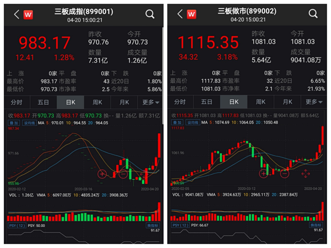胡先生之所以颇感痛心,主要因为新三板4月20日大涨。三板成指收涨1.28%;三板做市指数涨幅高达3.18%。