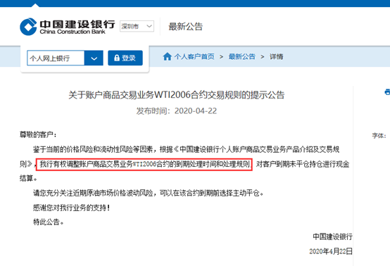 这里所说的“结算价”,是以银行冻结客户时的价格结算还是以WTI原油当天的结算价结算,也令投资者存疑。如果按照第二天凌晨5点北美原油的结算价来计算,早早在当晚22:00冻结客户账户的意义何在。