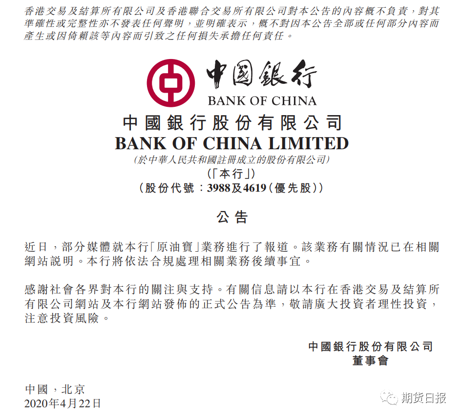 昨天深夜,中行官网发布公告:近日,部分媒体就本行原油宝业务进行了报道,该业务有关情况已在相关网站说明,本行将依法合规处理相关业务后续事宜。