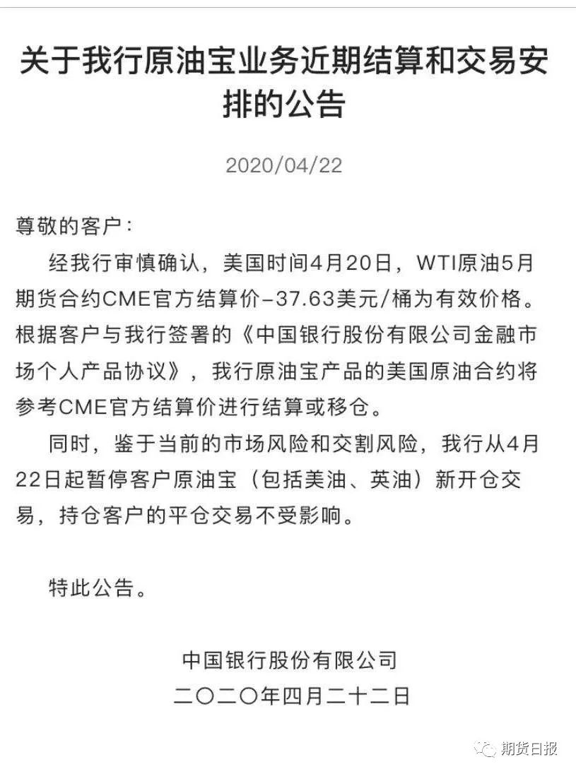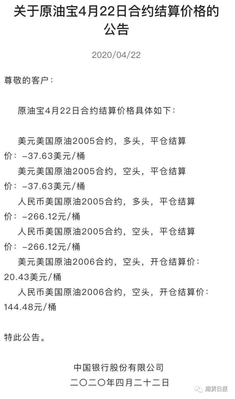 在昨天下午,中国银行官方陆续发布了《关于我行原油宝业务近期结算和交易安排的公告》和《关于原油宝4月22日合约结算价格的公告》,上述公告的观点主要有两条,一是原油宝WTI原油期货5月合约CME官方结算价-37.63美元/桶为有效价格,中国银行将据此对持仓客户进行结算或移仓,其中美元账户结算价格为-37.63美元/桶,人民币账户结算价价格为-266.12元/桶;二是4月22日起暂停客户原油宝新开仓交易。