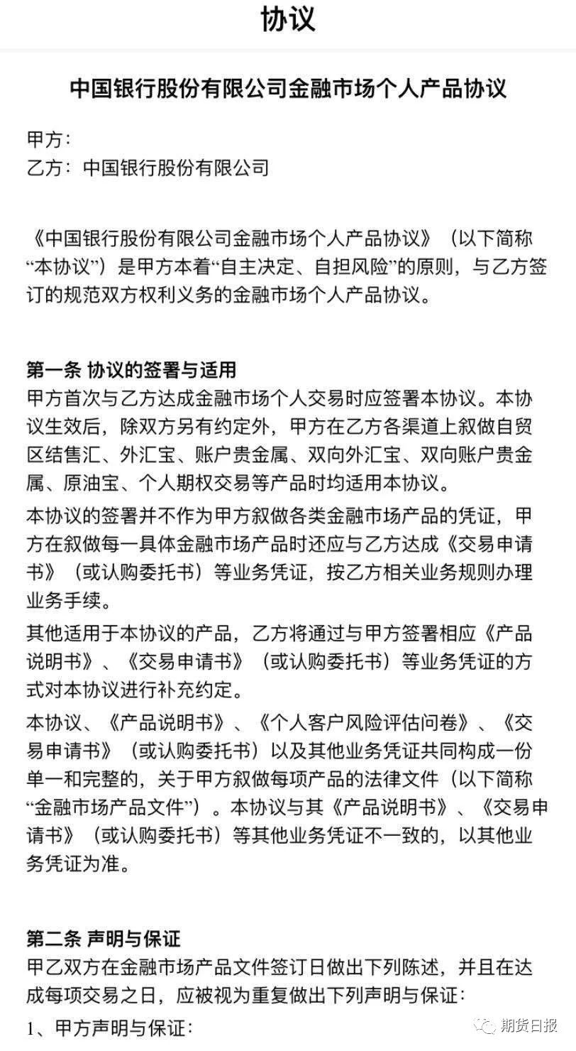 在开通“大宗商品”(即以前的原油宝)业务权限时,需要进行风险测评和签署《中国银行股份有限公司金融市场个人产品协议》。(如下图)