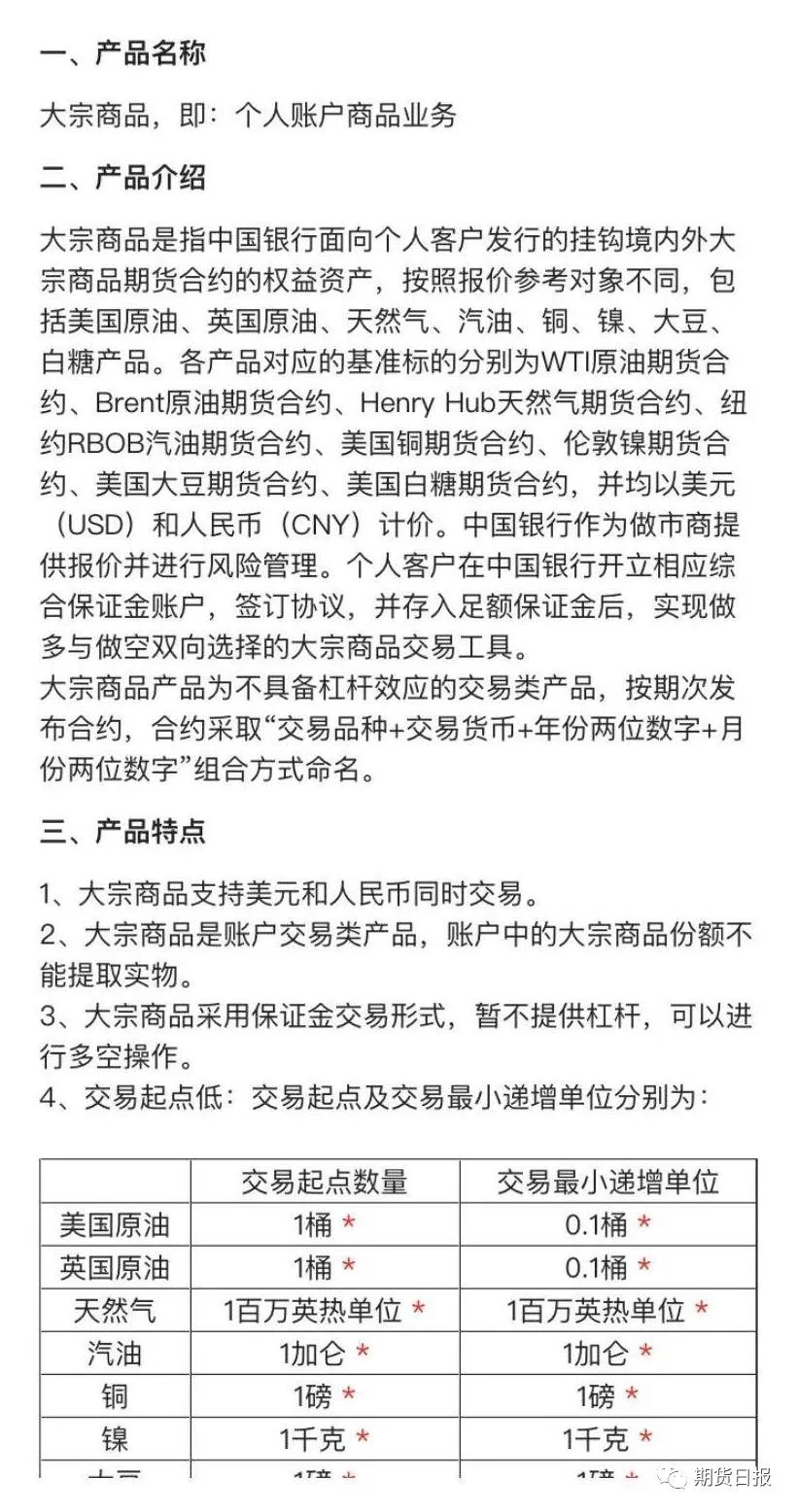 中国银行“大宗商品”业务是这样介绍的:大宗商品,即个人账户商品业务,指中国银行面向个人客户发行的挂钩境内外大宗商品期货合约的权益资产,按照报价参考对象不同,包括美国原油……等等。中国银行作为做市商提供报价并进行风险管理。