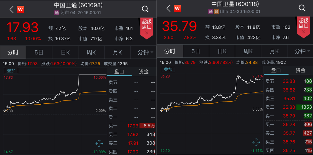 受此影响,今日午后,A股的卫星互联网板块集体飙升,截至收盘,中国卫通(601698)直线封板,中国卫星(600118)、北斗星通(002151)等个股大幅跟涨。