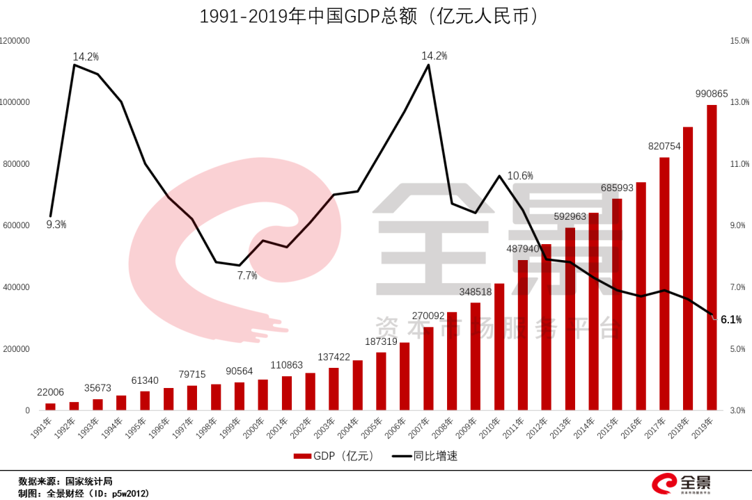 1981-2018年期间,中国经历前两大发展阶段:人口、土地等生产要素驱动;地产、传统基建为代表的投资驱动。中国经济规模不断发展壮大的同时,GDP增速开始呈现下行趋势,2019年中国GDP达到99.09万亿元,同比增速为6.1%,同比下降0.6个百分点。