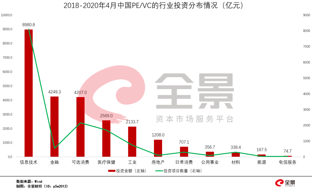 据Wind数据统计显示,2018-2020年4月份,中国PE/VC投资金额居前的行业分别是信息技术、可选消费、医疗保健、金融、工业。其中,信息技术产业发展与“新基建”紧密相关,累计投资金额高达8980.8亿元。