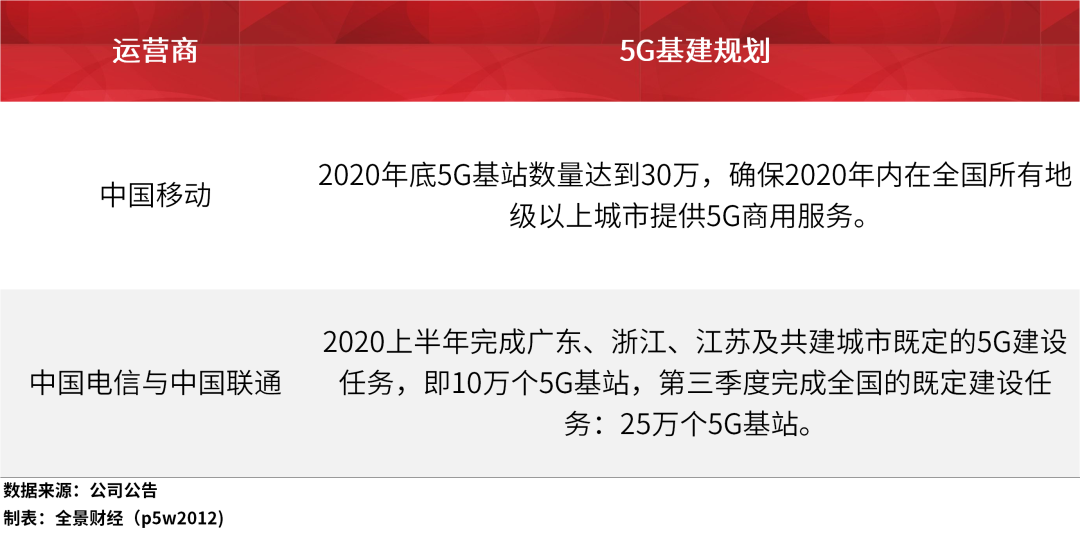 很显然,5G、大数据中心的部署、建设将进一步加快,投资进度大概率将超预期。以 5G 基站建设为例,此前中国三大运营商(移动、联通、电信)的5G基建计划为:
