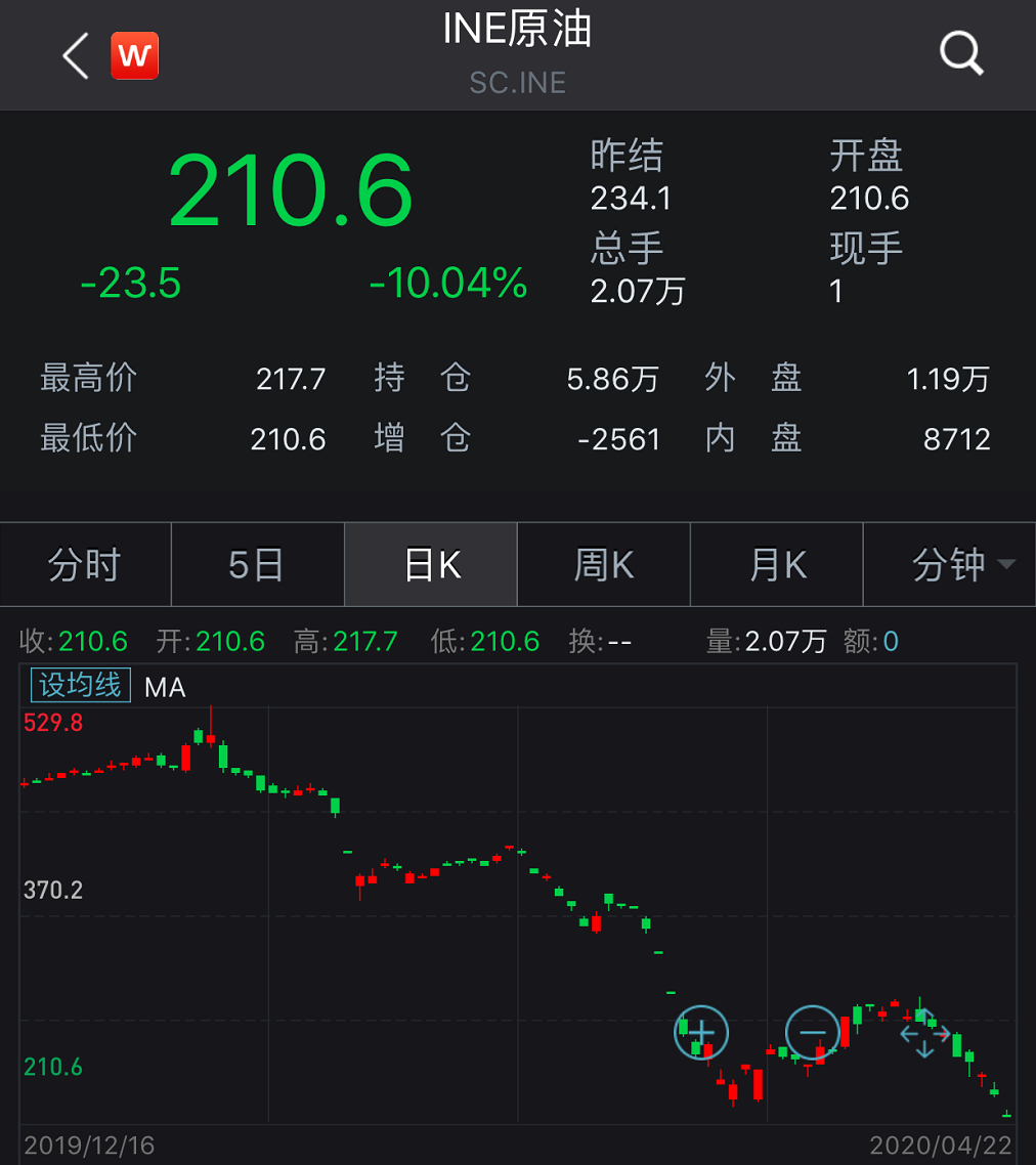 而据文华财经数据显示,4月20日,WTI原油5月期货合约报收-37.63美元/桶时,持仓量仍高达10.9万手(每手1000桶),其中7.71万手以-37.63美元/桶进行了平仓结算,负债合计高达29亿美元(约合人民币203亿元)。
