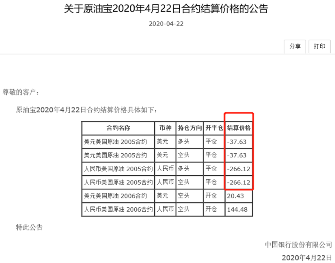 中国银行在公告中表示,原油宝产品的美国原油合约将参考CME官方结算价:-37.63美元/桶进行结算或移仓。