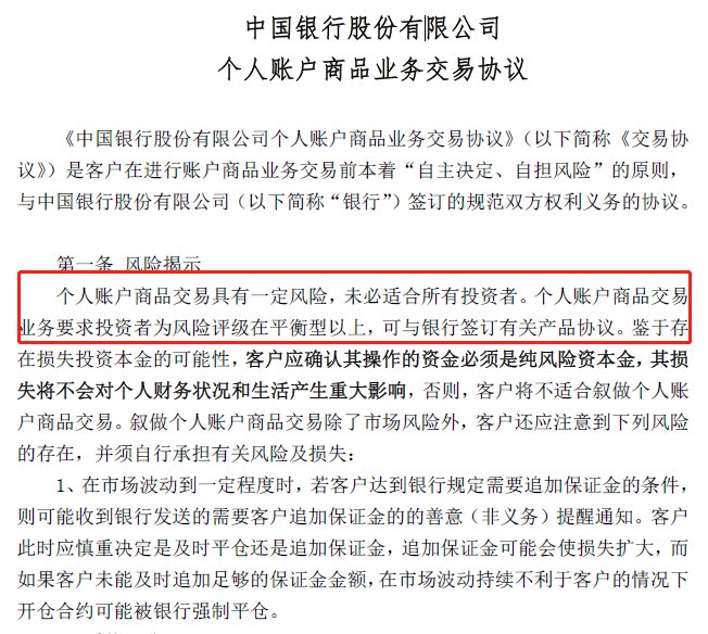 在中行最新版的协议中显示,个人账户商品交易业务要求投资者为风险评级在平衡型以上,可与银行签订有关产品协议。