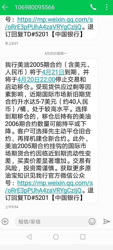 针对中国银行风险提示的问题,小易表示中国银行确实会通过短信的方式提示原油价格波动剧烈、升水差价较高的风险,APP上也有相应提示。不过,对于4月15日芝加哥商品交易所修改结算规则,允许能源期货合约以负数结算的消息,银行并未告知投资者。