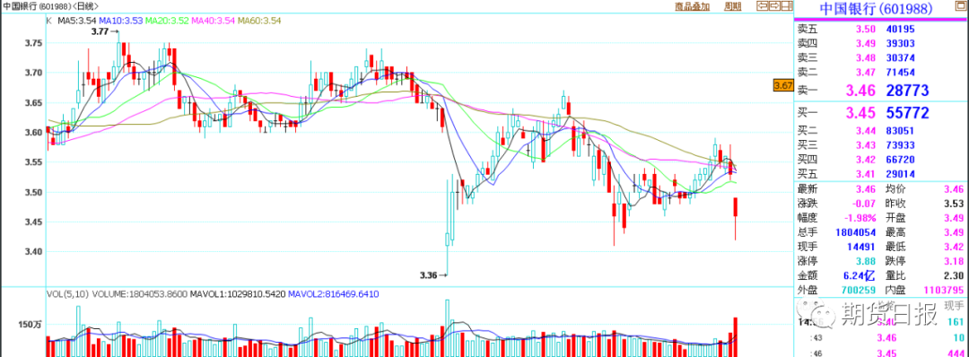 4月23日,中行“大宗商品”(原油宝)业务事件继续发酵,受投资者维权等多重因素影响,中国银行A股股价跳空低开于每股3.49元,随后快速低开低走,终盘报收于3.46元,全天下跌1.98%,总市值缩水逾206亿,跌幅大于工行、建行等上市银行。