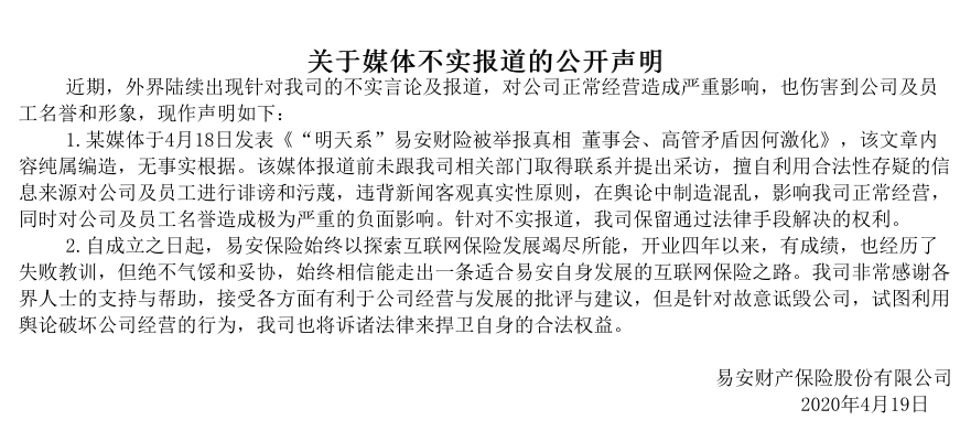 4月19日,易安保险发布《关于媒体不实报道的公开声明》,声明提到,某媒体于4月18日发表《“明天系”易安保险被举报真相 董事会、高管矛盾因何激化》,该文章内容纯属编造,无事实根据。