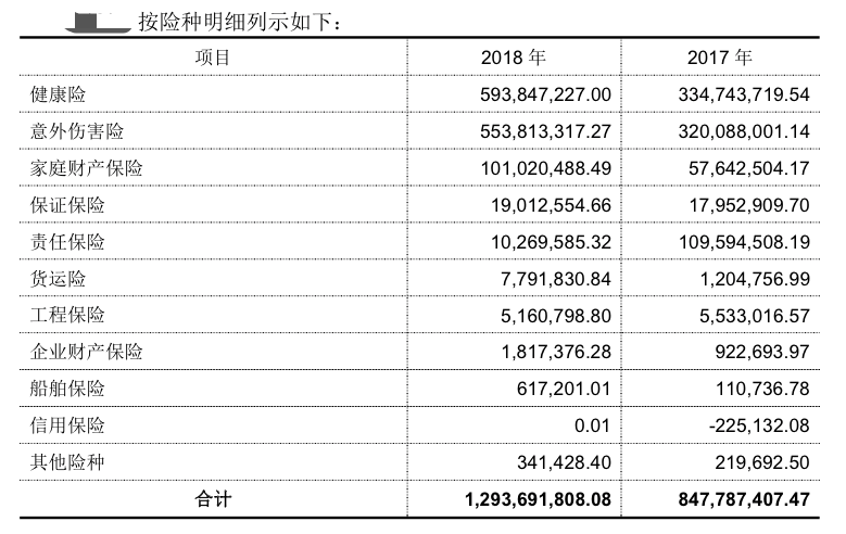 易安保险2018年、2017年各险种情况