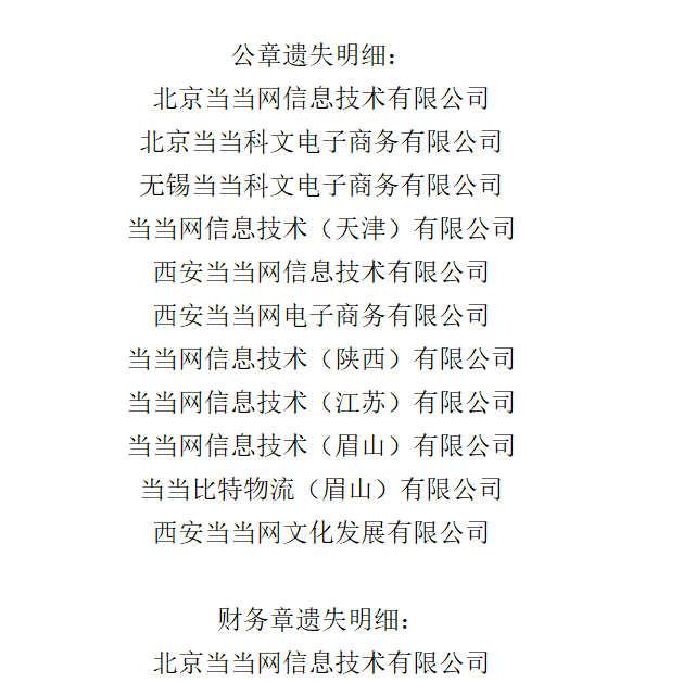 声明中宣布遗失的公章明细包括11枚公章,29枚财务章,北京当当网信息技术有限公司、北京当当科文电子商务有限公司的公章、财务章均在列。