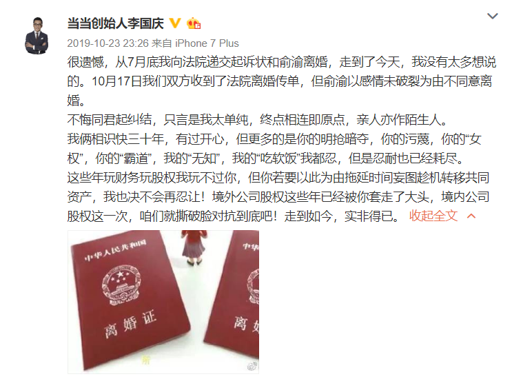 然而,2019年10月23日,李国庆再发微博称,7月底向法院递交起诉状和俞渝离婚,但俞渝以感情未破裂为由不同意离婚。决定不再忍让!撕破脸对抗争夺境内公司股权。