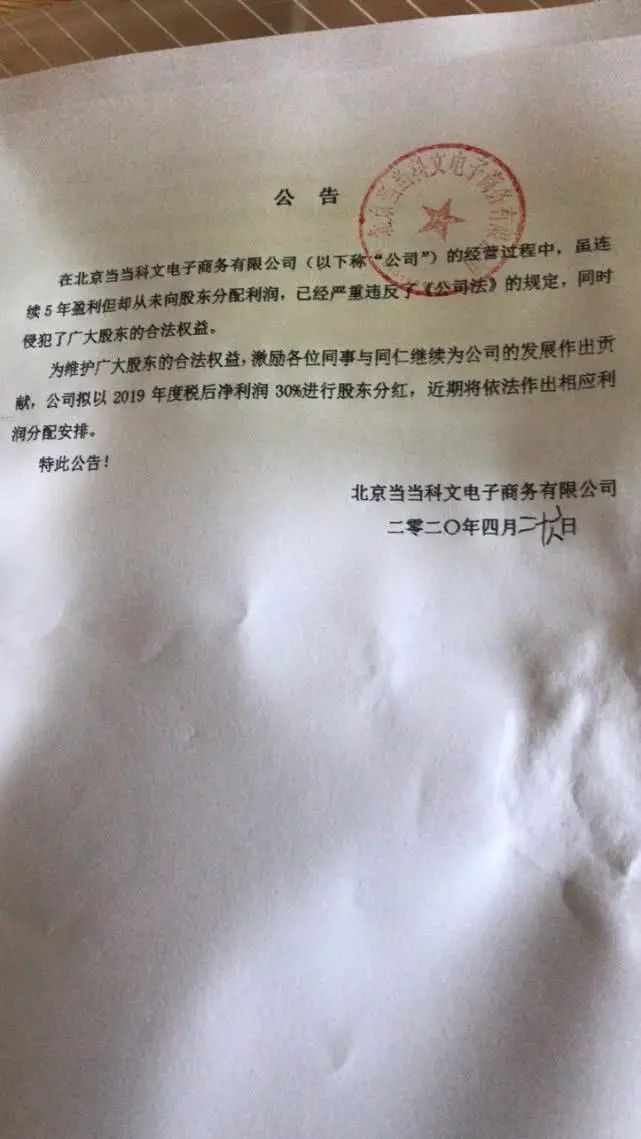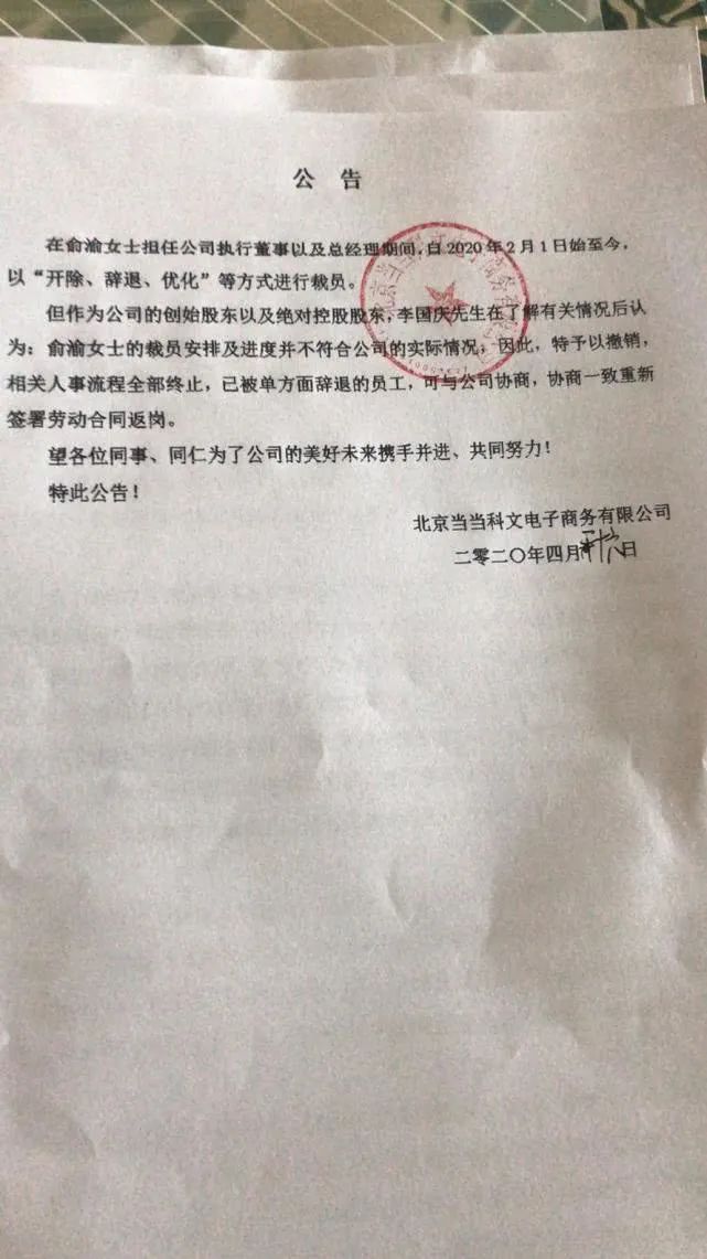 随后,网络上流传出《告当当网全体员工书》,称已于2020年4月24日召开临时股东会,并作出决议:公司依法成立董事会。自2020年4月24日起,俞渝不再担任当当公司执行董事、法定代表人及总经理。俞渝无权在当当公司公司形式任何职权,无权向当当员工发出任何指示,无权代表当当公司对外做出任何意思表示或者行为。