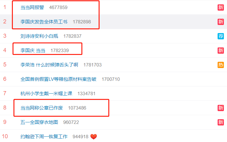 来看看微博热搜,前十就有四个热搜跟李国庆、当当网有关。
