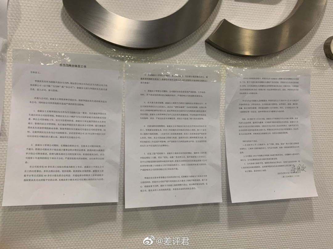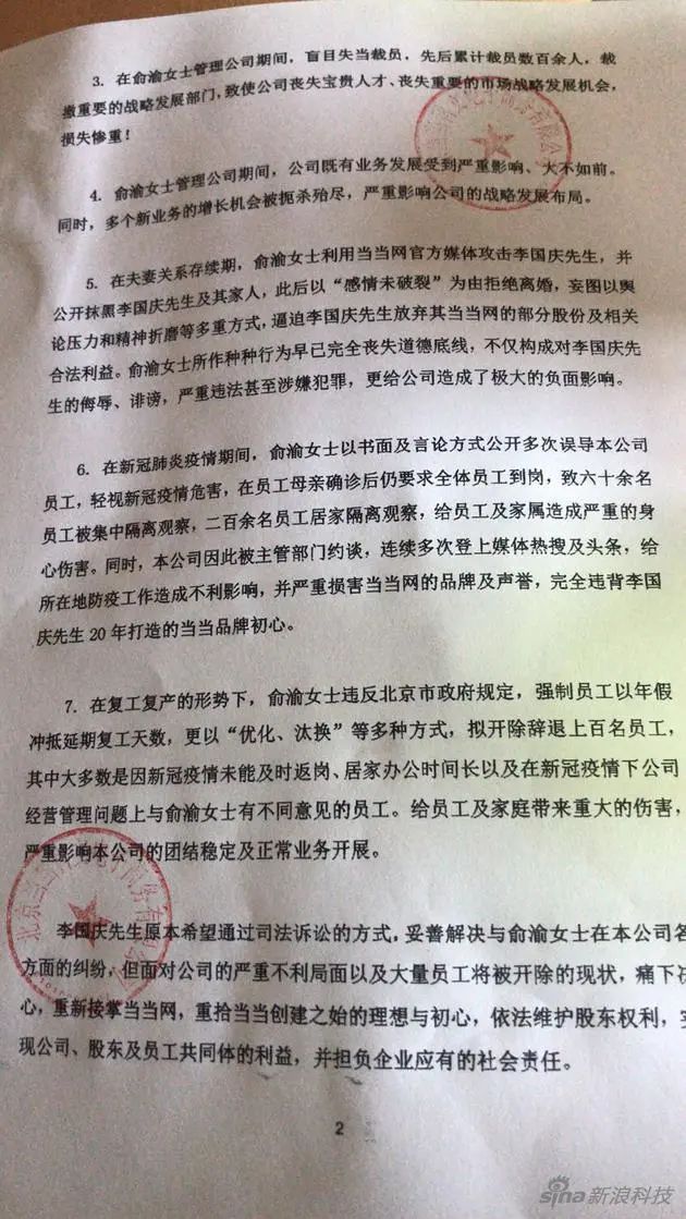 6、在新冠肺炎疫情期间,俞渝女士以书面及言论方式公开多次误导本公司员工,轻视新冠疫情危害,在员工母亲确诊后仍要求全体员工到岗,致六十余名员工被集中隔离观察,二百余名员工居家隔离观察,给员工及家属造成严重的身心伤害。同时,本公司因此被主管部门约谈,连续多次登上媒体热搜及头条,给所在地防疫工作造成不利影响,并严重损害当当网的品牌及声誉,完全违背李国庆先生20年打造的当当品牌初心。