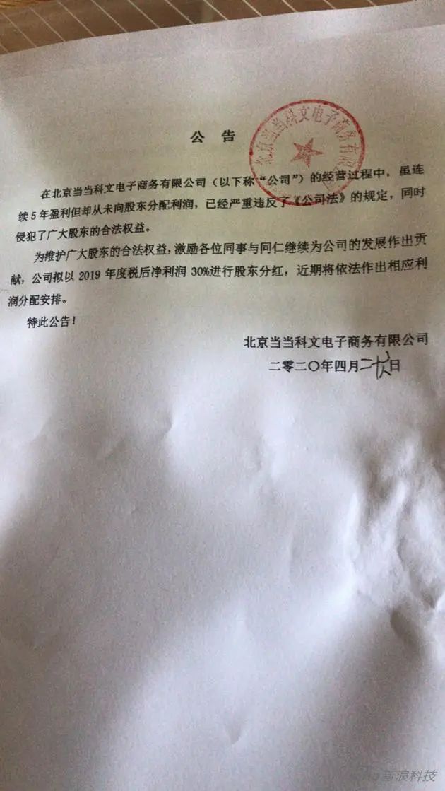 当当网在声明中表示,当当网以及关联公司公章、财务专用章失控期间,任何人使用该公章、财务专用章签订的任何合同、协议以及具有合同性质的文件或其他任何书面文件,公司将不予承认。公章、财务章、财务部门章即日作废。