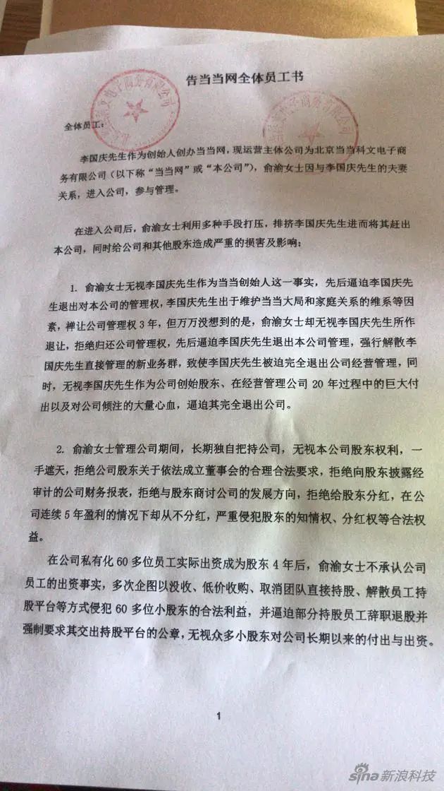 然后刚刚,又有一份告当当网全体员工书出现,里面细数了俞渝7大罪状,简单概括为:
