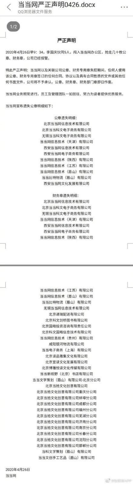 4月26日下午,当当网的声明中表示,2020年4月26日早9:34,“李国庆伙同5人,闯入当当网办公区,抢走几十枚公章、财务章,公司已经报警。”