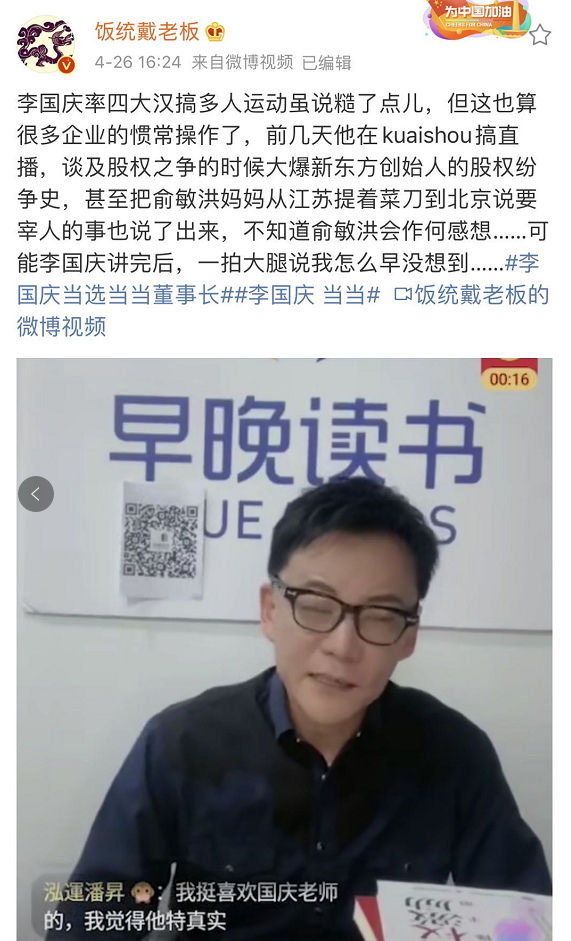 4月26日消息,据微博大V@互联网信徒王冠雄爆料,李国庆今日率4条大汉上门抢当当公章。据悉李国庆与俞渝之前已经历“八王议政、当众摔杯、浴池梅毒、票圈撕破脸”等事件。