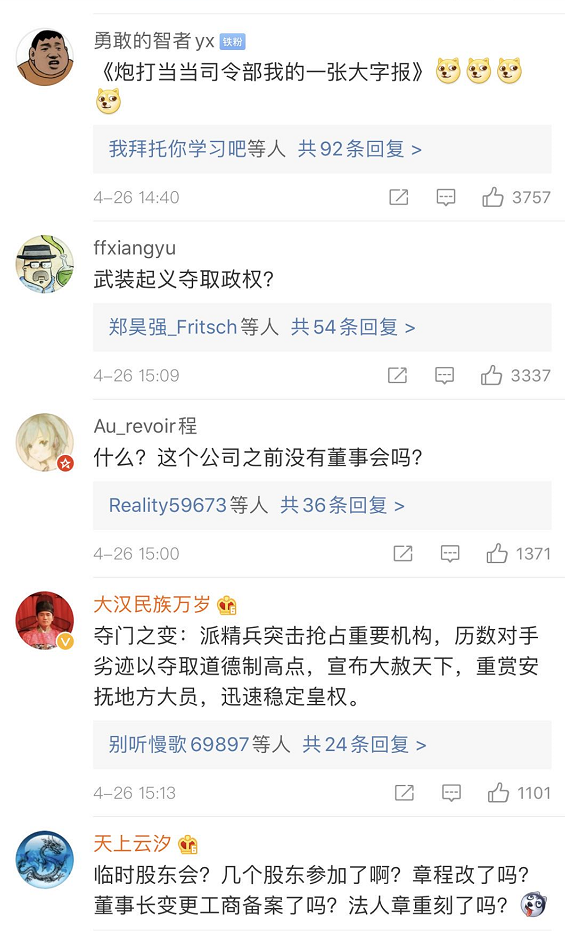 原来,今日有消息透露,李国庆率4大汉赴当当抢公章,并发布《告当当全体员工书》。对此消息,李国庆向@新浪科技 确认,已接管当当。在《告当当全体员工书》中,李国庆表示,已于4月24日依法召开临时股东会,李国庆当选董事长与总经理,全面接管公司。俞渝仅为董事,无任何职权。