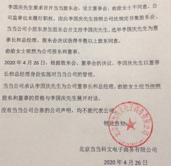 针对当当网的动作,4月26日晚,当当创始人李国庆再次发声明回应接管当当一事。声明表示,当当公司承认李国庆先生为公司董事长和总经理。俞渝女士应当按照股东和董事的资格与李国庆先生展开对话。没有当当公司公章的公司声明,均不能代表公司。李国庆方面还公布了盖了公司公章的声明。