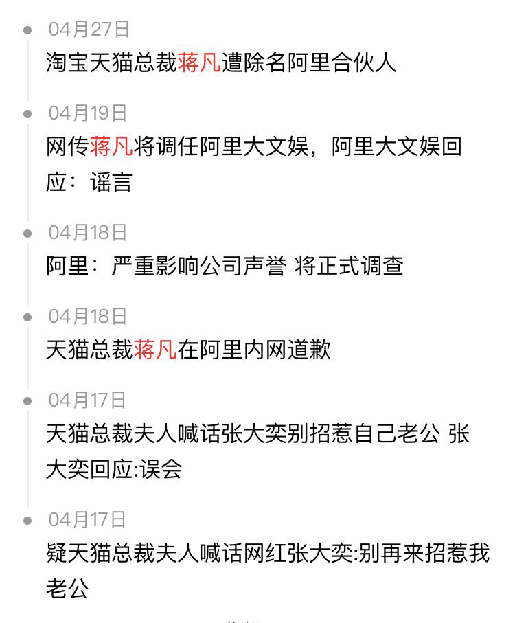 有消息称,有“反腐女王”之称的阿里创始人18罗汉之一蒋芳也参与了此次调查,彼时内部消息显示,初步审查后,可以基本断定蒋凡与张大奕没有利益输送关系。此外,有市场消息透露,蒋凡可能调任阿里大文娱集团,然而,4月19日晚,阿里巴巴很快对该传闻回应:“系谣言。”