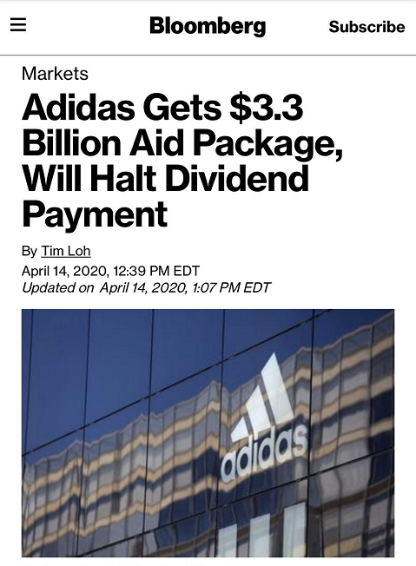 据彭博社报道,4月15日,阿迪达斯宣布获得一笔30亿欧元(约合32.8亿美元)的信贷援助。